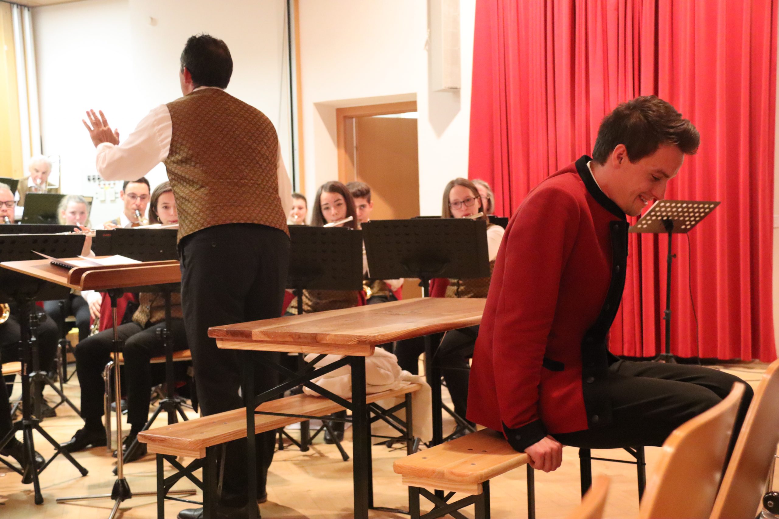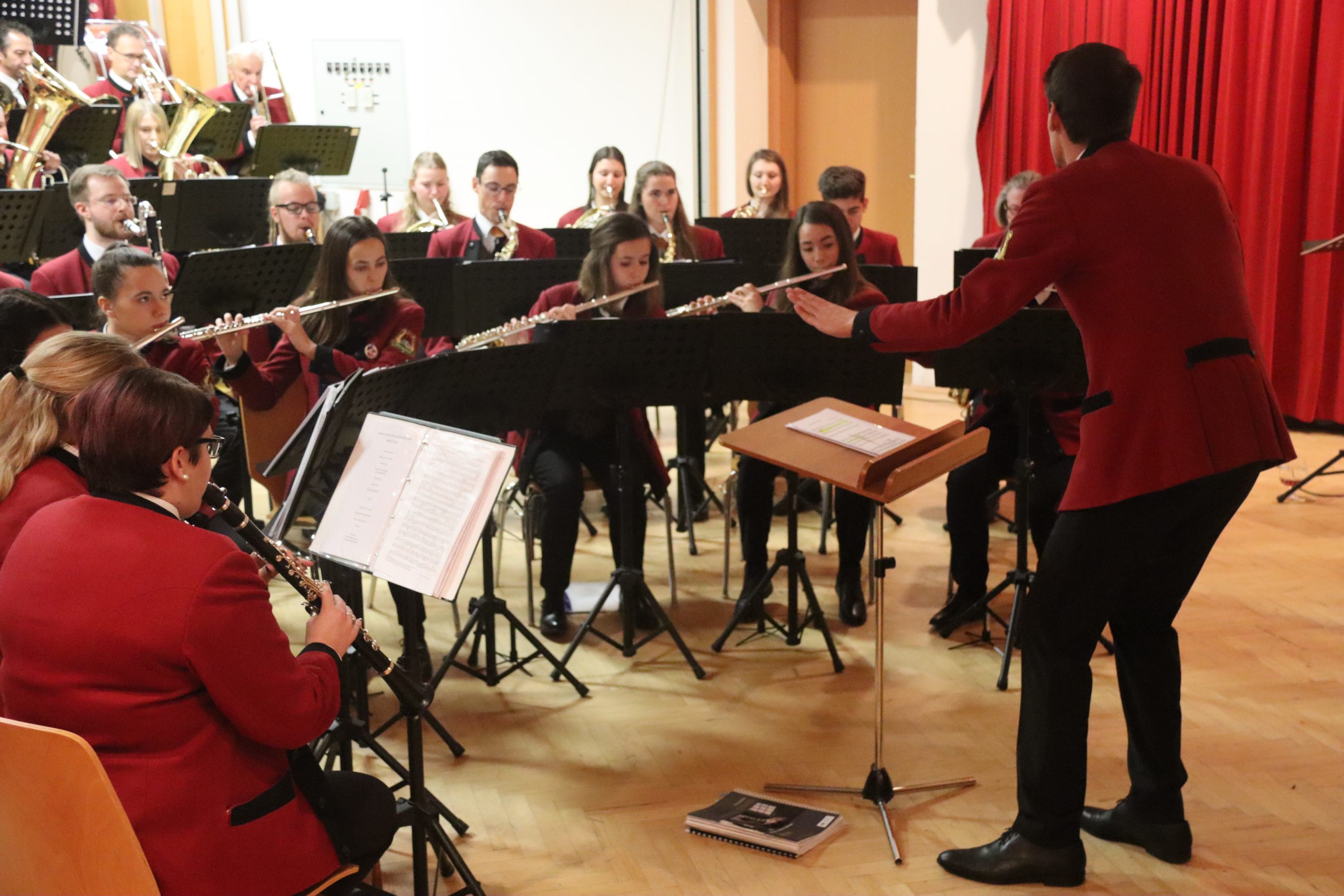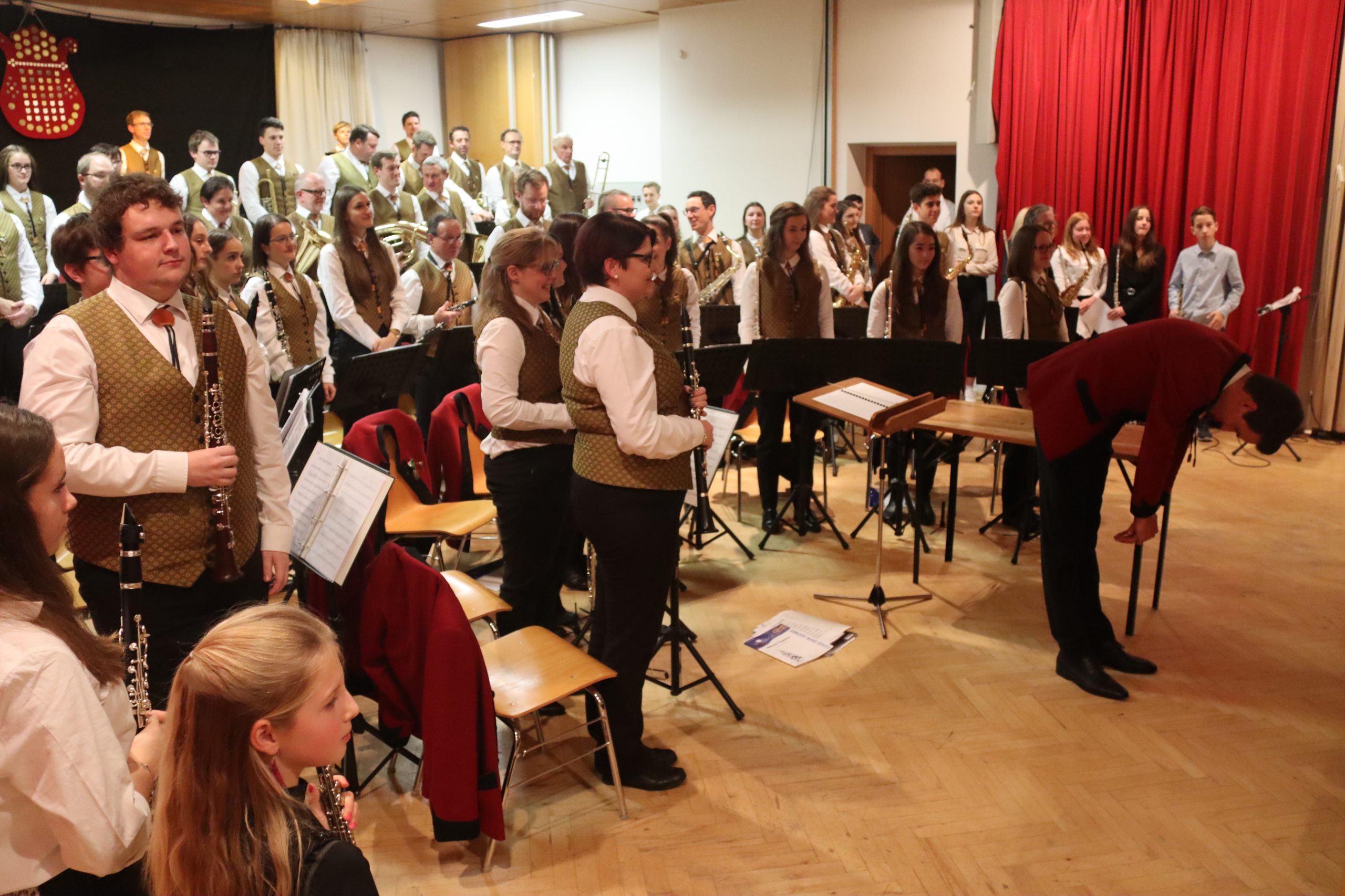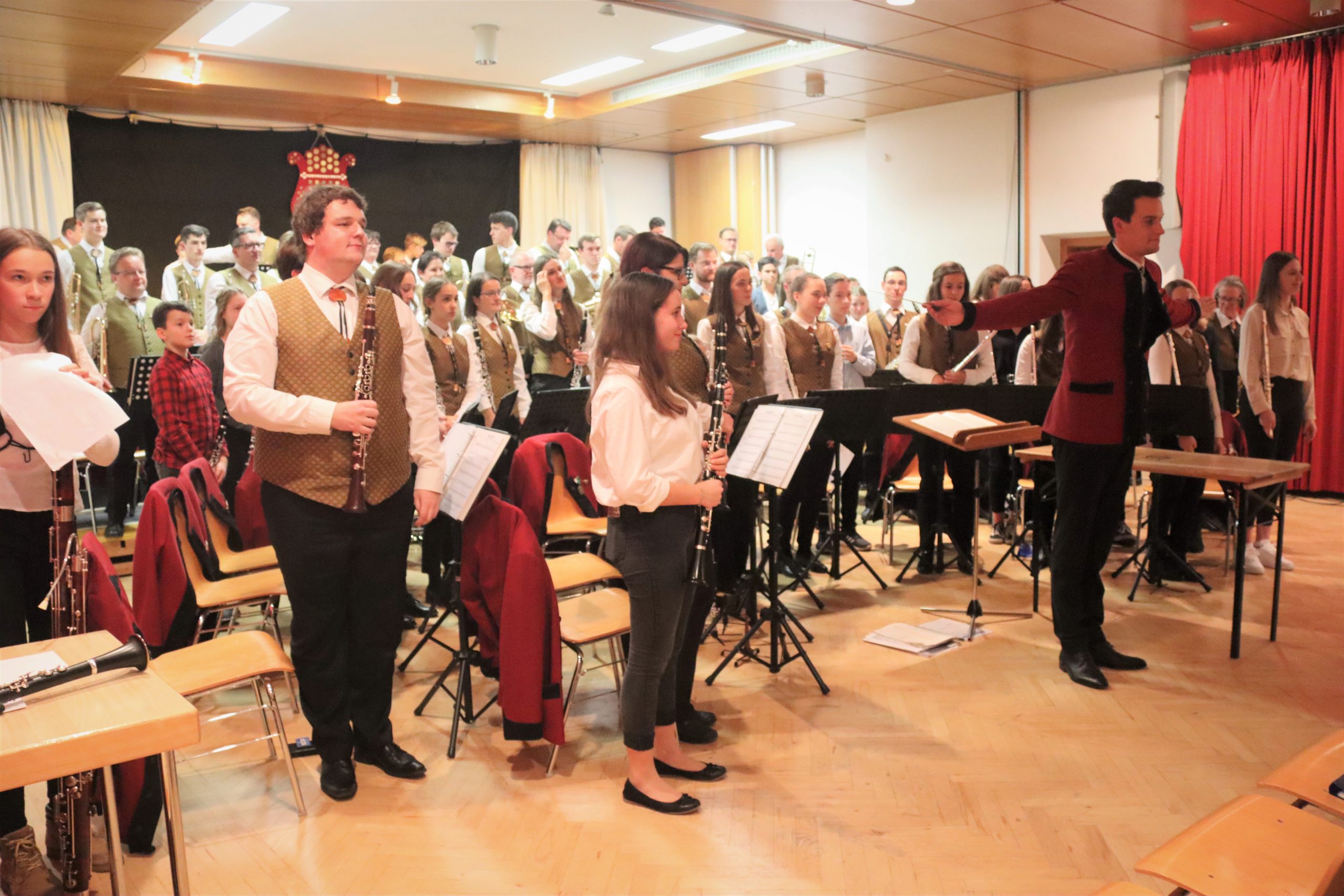 Doch bevor der Musikverein von seinem Kapellmeister Abschied nahm, zeigten die Musikerinnen und Musiker alle Facetten ihres musikalischen Könnens: Mit dem Astronautenmarsch von Ernst Mosch starteten die mehr als 50 Musikerinnen und Musiker mit viel Energie in ihr Konzert. Danach folgten unter anderen die Ouvertüre „König David“ von Georg Stich oder die Polka „Zeitlos“ von Martin Scharnagl (Vierablech); den Schlusspunkt der ersten Hälfte setzte das Jugendensemble unter der Leitung von Sabine Raith, Matthias Reichmann und Marius Laffer. Die jungen Musikerinnen und Musiker verzauberten das Publikum mit „I love Polka“ von Alexander Pfluger, „Don’t Cry For Me Argentina“ aus dem Musical „Evita“ sowie mit der „1st Classic Suite“ – einem bunten Potpourri bekannter klassischer Melodien.