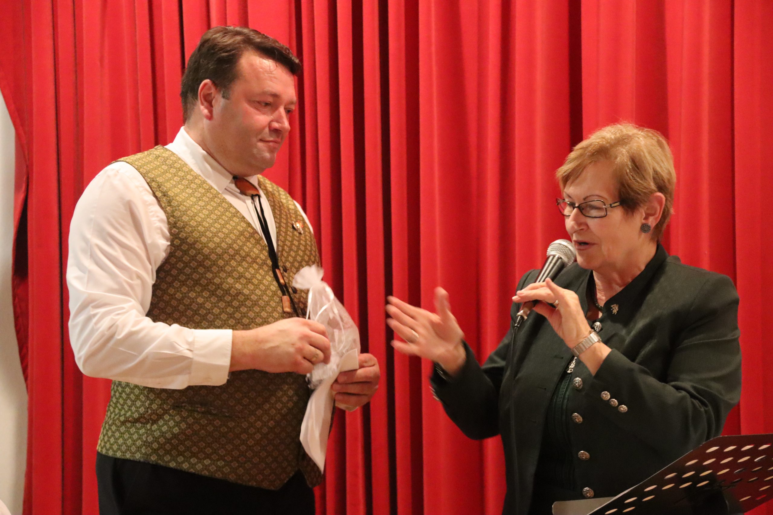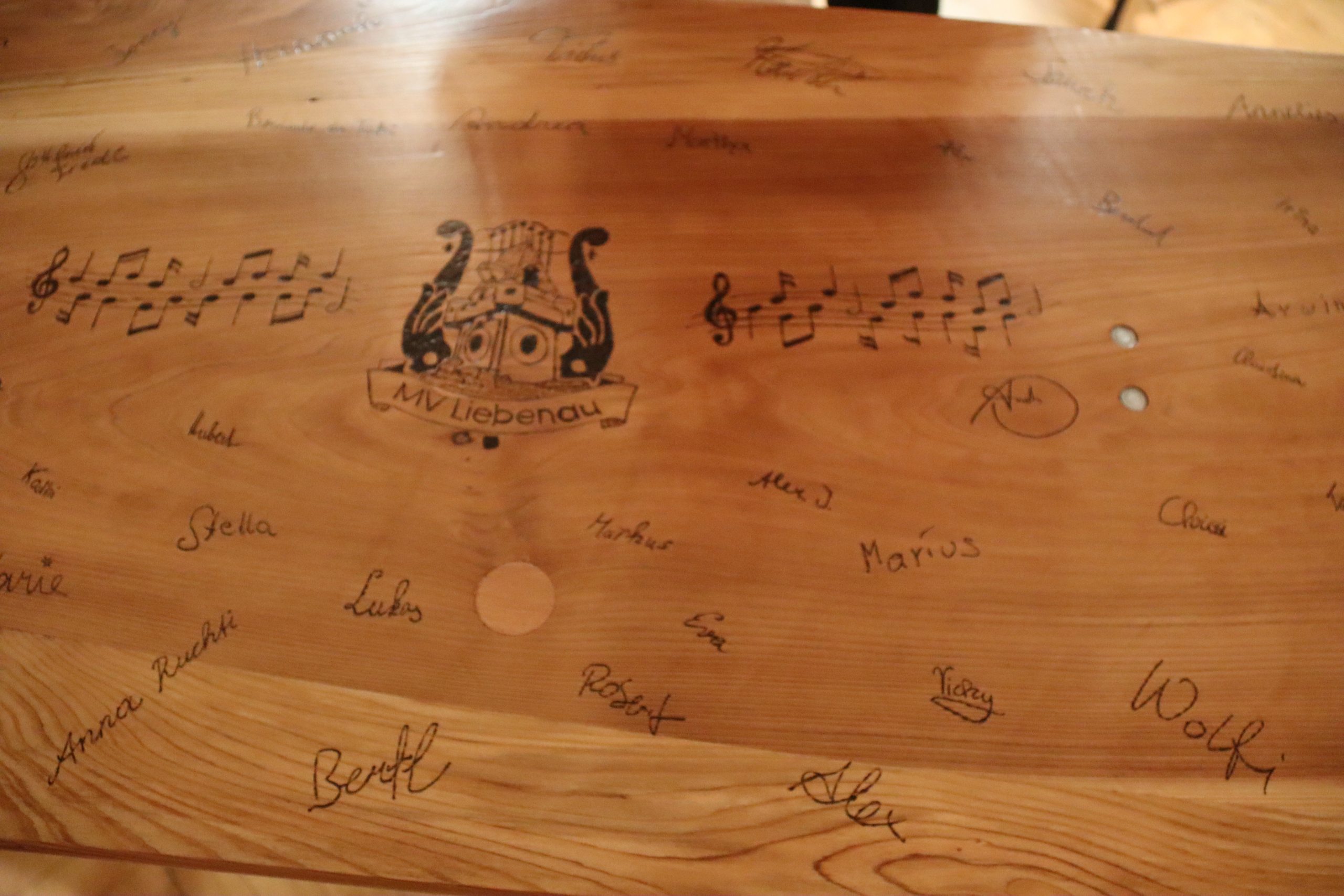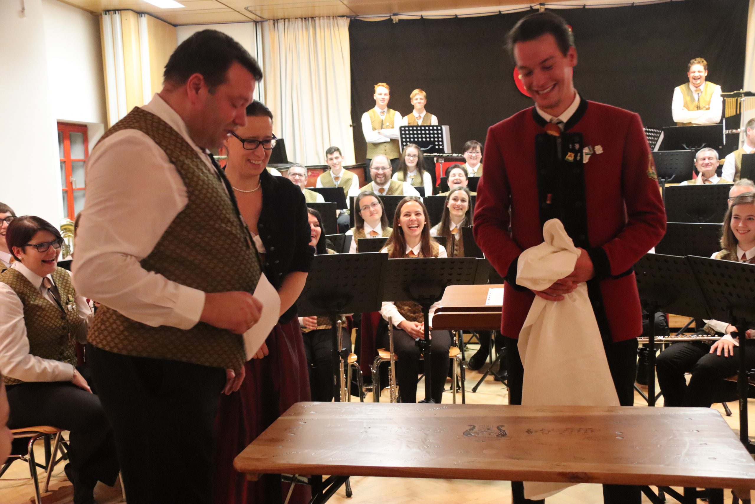 Doch das Konzert war da noch nicht zu Ende: Nach dem 94er überraschten die Liebenauer Musikerinnen und Musiker ihren scheidenden Kapellmeister mit einem Potpourri dreier Stücke, die Johannes Thaler in den vergangenen sieben Jahren bei zahlreichen Frühschoppen anspielen ließ: „Böhmische Liebe“, „Der Böhmische Traum“ und – für den aus Tirol stammenden Kapellmeister fast selbstverständlich – „Dem Land Tirol die Treue“. Außerdem gab es für Johannes Thaler noch eine Bierzeltgarnitur, auf dem sich der gesamte Musikverein Liebenau verewigt hatte.